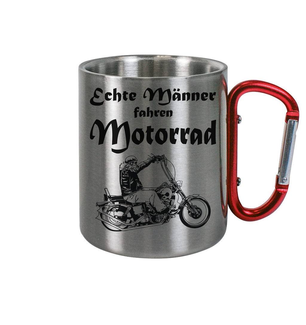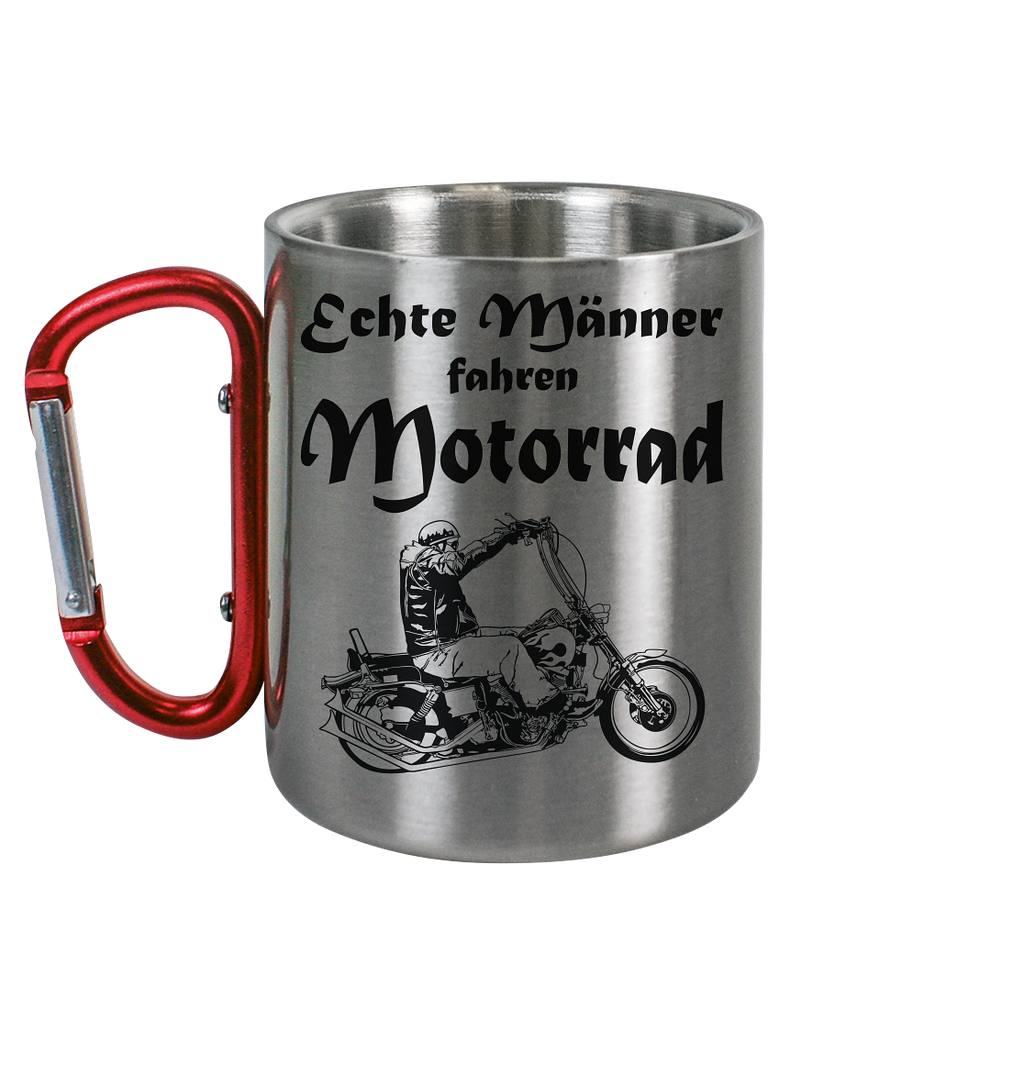 Diese Edelstahltasse mit Karabinergriff ist das ideale Geschenk für echte Biker. Der Spruch „Echte Männer fahren Motorrad“ macht die Tasse zu einem echten Hingucker und zeigt auf humorvolle Art die Leidenschaft fürs Motorradfahren.