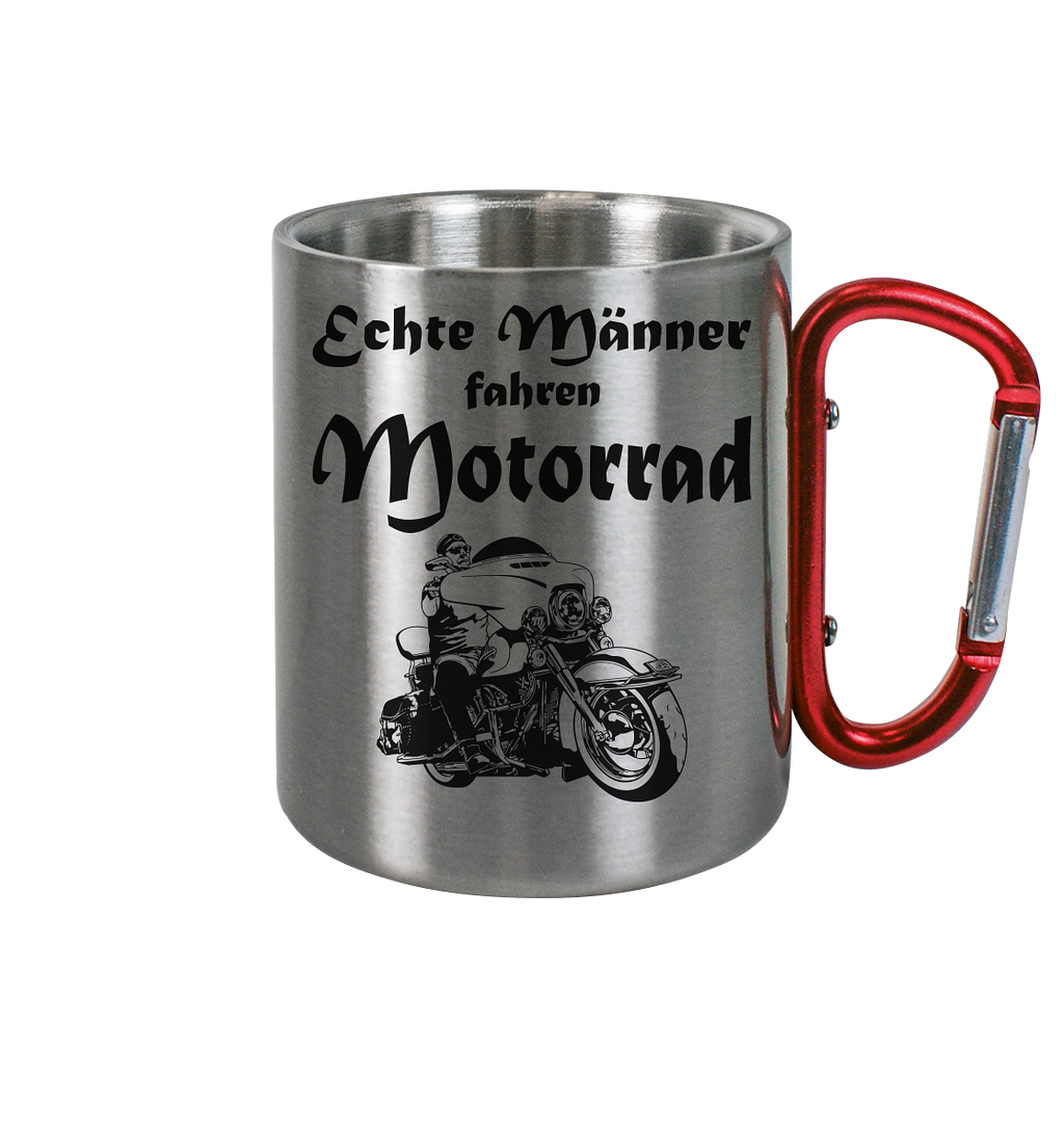 Diese Edelstahltasse mit Karabinergriff ist das ideale Accessoire für alle Motorradfans. Mit dem coolen Spruch „Echte Männer fahren Motorrad“ und dem detailreichen Biker-Motiv wird sie garantiert zum Hingucker – ob auf Tour, beim Camping oder zu Hause.
