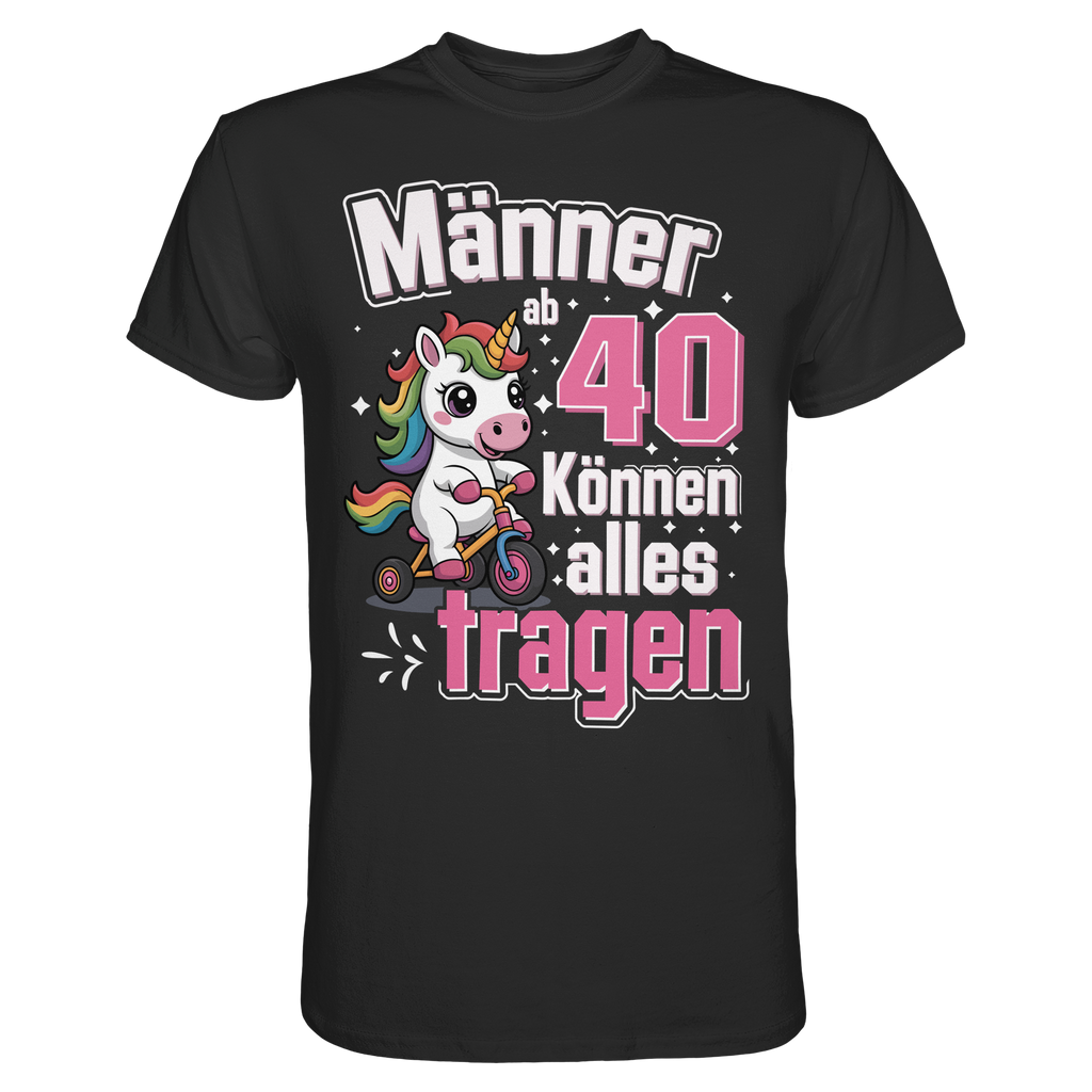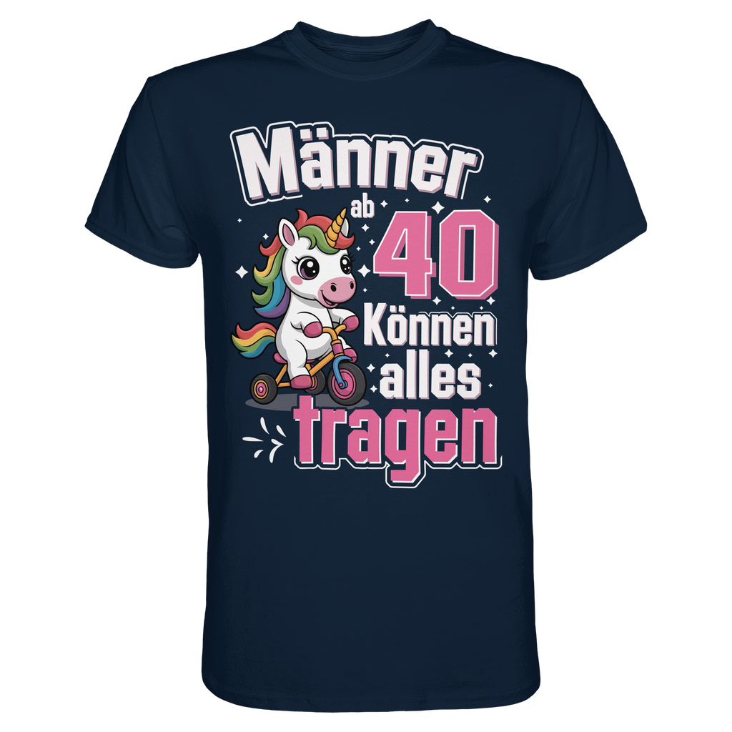 Mit diesem witzigen „Männer ab 40 können alles tragen“-T-Shirt zeigst du Humor und Gelassenheit. Das bunte Einhorn auf dem Dreirad macht das Shirt zu einem echten Hingucker – perfekt für Geburtstagsfeiern, Partys oder einfach als Funshirt im Alltag.